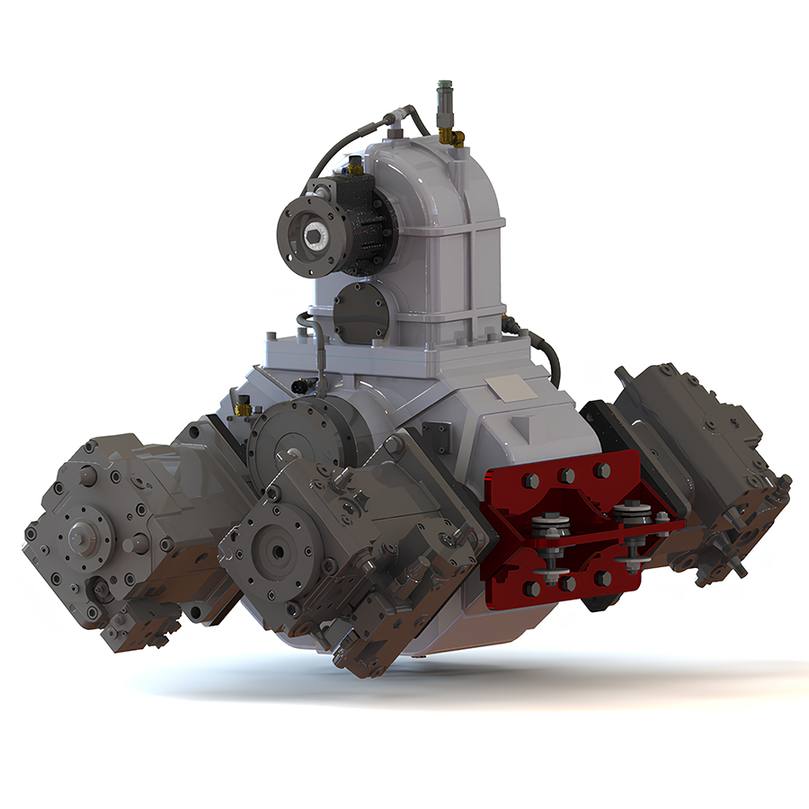 KMS.3501 is Multipurpose Heavy Duty Hydrostatic Gearbox. KMS.3501 has 2 Hydraulic Pump Pads and 2 Hydromotor Pad at bottom axis and 2 more additional outoput at top axis. There are SAE-C , SAE-D and SAE-E direct pump pad options with Companian SAE & DIN Standard Flanges.